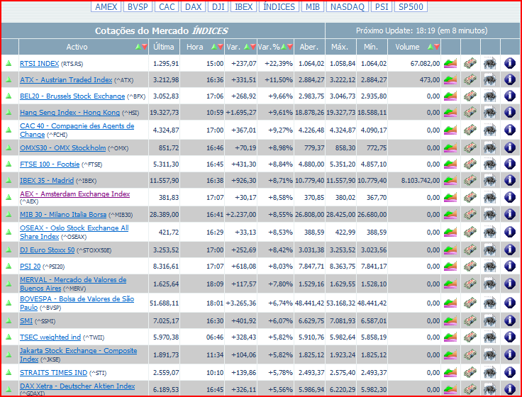 Os ganhos dos índices norte-americanos acompanham a forte valorização dos congéneres europeus que seguem a ganhar entre os 5,83% e os 9,48% impulsionados pelo sector financeiro. São vários os índices que registam ganhos recorde.
