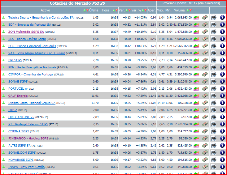 Acho graça a isto, a correcção das quebras dos últimos dias deram nisto, ainda por cima com as medidas tomadas. O limitar todos os short-sellings até Outubro não irá salvar isto a meu ver mas vamos a ver...